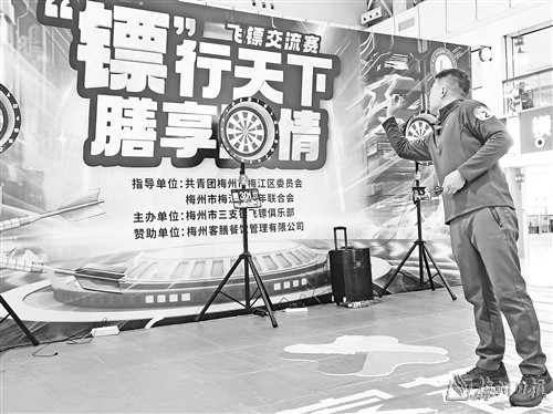 本报讯 (记者陈潮华)日前,一场飞镖比赛在梅城客都汇商场举行,吸引了29名选手参赛,也吸引了众多观众驻足观看。飞镖比赛在梅州还是新鲜事,据了解,这场由共青团梅江区委和梅江区青年联合会指导,三支镖飞镖俱乐部主办的比赛是我市首次举办此类活动,旨在梅州推广这项运动。