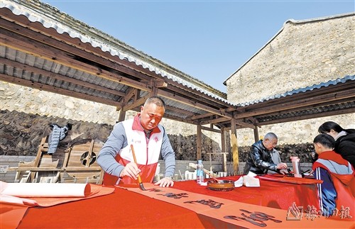 书法志愿者现场挥毫,为当地居民写春联送祝福。