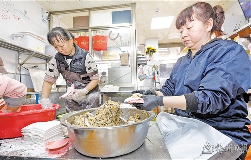 县城东风市场一家大埔小吃特产店内,店员在制作笋粄等传统美食。