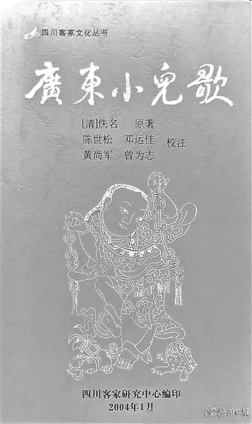 《广东小儿歌》是一本用“广东土音”,即“土广东话”(四川地区的客家话)编写的,至今仍流传于成都东山客家地区的儿童歌谣集。除前言后记外,全集由30首儿童歌谣组成。原书作者佚名,写作时代约在清末至民国初年,传诵地区主限于成都东山。《广东小儿歌》的歌谣分为“劝”和“戒”两大部分,主要内容归纳为:提倡勤俭,反对懒惰 ;提倡好学上进,讲究人伦道德 ;提倡孝顺父母,和睦家庭;提倡诚实守信,反对损人利己等等。作者旨在用儒家传统礼教和伦理道德标准对儿童进行“劝诫”和说教,以便让所有儿童从小明辨是非,树立正确的人生观,学会做人,“藉以知善恶,而明吉凶”,并进而达到“劝得世上好人多,齐家同唱太平歌”。
