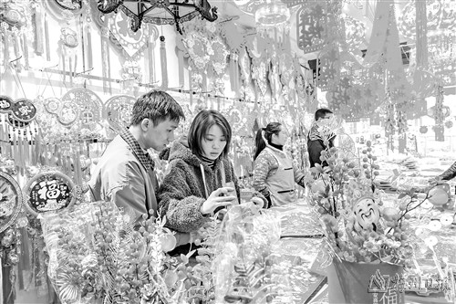 1月19日,市民在贵州省安顺市西秀区年货市场选购新春饰品。