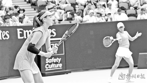 1月19日,王欣瑜(左)/郑赛赛在比赛中。当日,在墨尔本进行的2025年澳大利亚网球公开赛女子双打第二轮比赛中,王欣瑜(中国)/郑赛赛(中国)2∶0战胜库德梅托娃(俄罗斯)/柴原瑛菜(日本)组合,晋级下一轮。(新华社发)