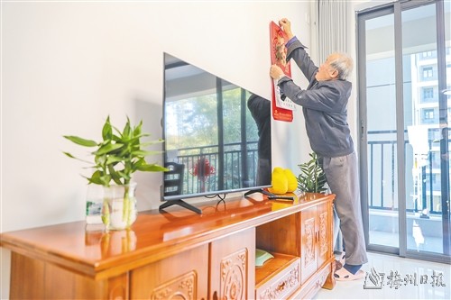 2025年1月24日上午10时,和煦的阳光洒落在宽敞明亮的阳台上,蕉岭广州小镇的住户陈海祥站在客厅中央,小心翼翼地拿着一卷红彤彤的“福”字,仔细地比对位置,准备贴上墙。不远处,新购置的智能煮水壶中,开水正咕咕冒着热气。“前天我们刚刚搬进来,特意挑了个好日子,今天叫上亲戚到家里一起吃入伙饭,图个喜庆。”见记者到来,陈海祥泡了热茶热情招待。陈海祥的喜悦之情溢于言表:“真的很感谢党和政府的关爱!我这辈子都没有想过可以住上这么好的楼房,更没想到还有那么好的橱柜和厨电。”
