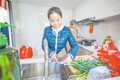 1月21日,记者来到梅县深圳小镇时,恰好遇见刘干松喜迁新居,道贺声、一家大小的欢喜声充满了客厅,他的女儿刘晓燕在厨房里忙着做新居的第一顿团圆饭。“我们是从桥背村搬过来的,没想到在春节前就顺利搬进了新房。小区环境相当好,以后赴圩也更方便了。”75岁的刘干松激动地说,女儿和孙辈们也提前从深圳回来过年了,一家人团团圆圆的。