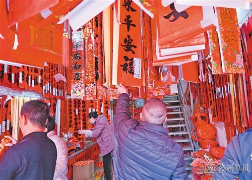 售卖春联的摊位红彤彤一片,将年味烘托得愈发浓郁,将春节氛围感“拉满”。“福星高照平安宅 好景常临康乐家”一副副春联苍劲有力的字迹里饱含着对新一年的美好向往。除了春联,各式各样的福字富有创意,有的福字融入了剪纸元素,花鸟鱼虫栩栩如生;有的福字则印着俏皮的蛇图案。