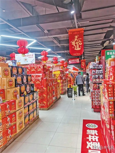 超市应节商品丰富,市民选购年货感受新春的喜庆。