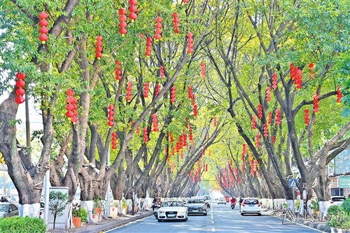 梅城梅江大道的路树挂上了一串串红灯笼。(钟小丰 摄)