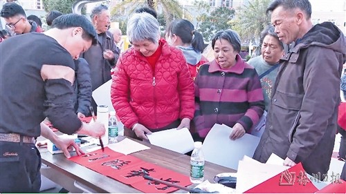 本报讯 日前,由五华县文化广电旅游体育局主办、县文化馆承办、市县书法家协会协办的五华县2025年“我们的中国梦——文化进万家”挥春送福志愿服务活动在五华奥体中心广场成功举行。活动以书写春联和“福”字为载体,将浓浓的年味儿和美好的新春祝福送到基层、送进千家万户。