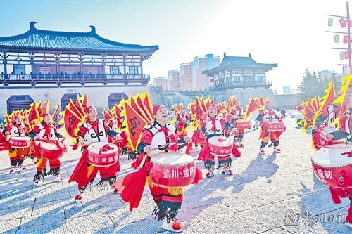 1月28日,在河南洛阳隋唐洛阳城天街,鼓手们进行洛川蹩鼓表演。新春将至,神州大地处处洋溢着喜庆的节日氛围。(新华社发)