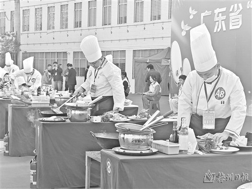 兴宁市明珠文化广场分外热闹,广东省“百县千碗”暨兴宁鸽美食大赛热火朝天。活动不仅有厨艺竞赛、厨艺表演,还有美食展销和兴宁鸽主题版画体验等活动,让市民游客在大饱口福的同时,感受兴宁的餐饮特色。