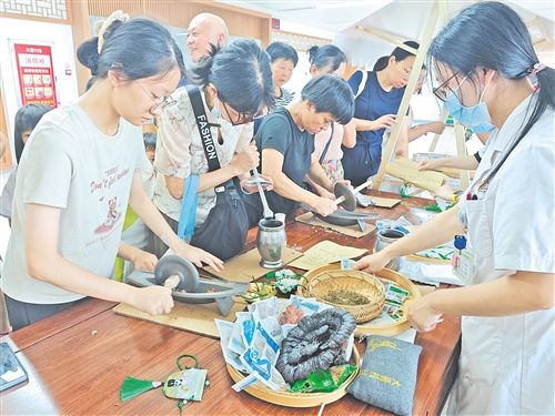 活动现场还准备了免费养生茶饮和传统膏方,供市民品尝。“识百草”“巧手称”也吸引了市民积极参与,大家走进中药世界,辨识常用的中药材,了解其性味功效,并学习传统中药调剂工具——戥秤的使用方法,体验“一钱一两见功夫”的精湛技艺。“制香囊”“调茶饮”更是大受欢迎,市民亲手参与制作香囊,或学习调配适合自己的简易养生茶饮,把健康“带回家”。
