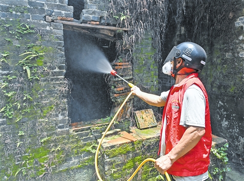 7月25日,工作人员在佛山市顺德区庄头村喷药消杀蚊虫。