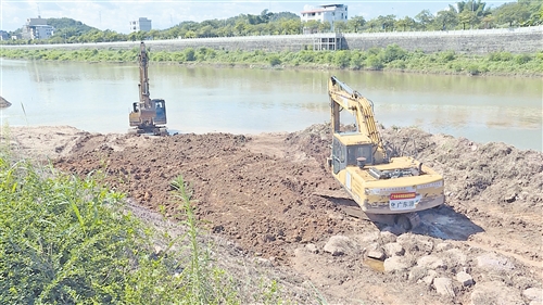 挖掘机在河床上进行河道平整作业。(赖锋 摄)