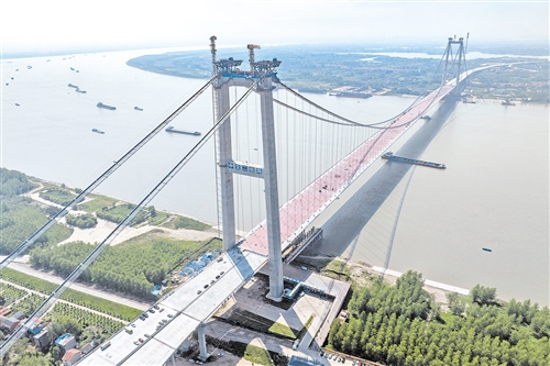 据了解,新港高速公路武汉双柳长江大桥及接线工程是国家高速路网武汉都市圈环线重要组成部分,路线全长35.043公里,其中跨江主桥主跨1430米、宽50.5米,设计时速120公里,采用双向8车道设计,是目前长江上在建的最宽钢箱梁悬索桥。