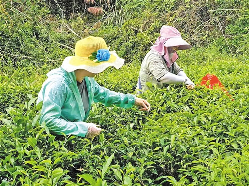 只见茶树叶绿,嫩芽绽绽,其色浅绿,其质柔嫩,吾等欣然。黎叔先给我们示范讲解采茶手法。我们便迫不及待戴好遮阳帽子,携带装茶青的编织袋入垄开采。第一次采茶,没有经验,眼手配合慢,似要定睛看明,才敢下手摘之,黎叔见状,再次讲解,要取嫩的采,不要采到茶梗处,这样会影响茶的品质与出茶量。在黎叔的手把手传授下,大家慢慢渐入角色,手也由生转熟,并渐渐在茶树面上轻盈翻飞采摘了。见我们都基本掌握方法,黎叔便放手回家去做别的事了。