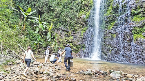 “西阳文旅星推官”团队在西阳镇溪田村拍摄瀑布露营镜头。(西阳镇政府供图)