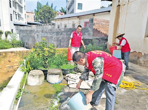 “家中不留‘小水塘’,蚊子无处把身藏”。在蕉岭县长潭镇堑垣村,长潭镇党群服务中心干部在清理积水杂物的同时,还走进村民家中发放基孔肯雅热防控宣传单,耐心讲解发热、出皮疹、关节剧痛等典型症状以及预防的核心要点,并帮助村民清理房前屋后容易积水的容器。