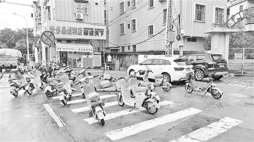 梅城龙坪路一小区门口的斑马线上随意停放着不少共享电动自行车。(陈坚平 摄)
