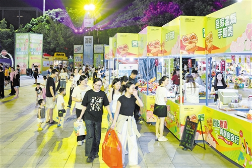 当天晚上,院士广场分外热闹。现场设置了展示非遗文创、手作商品、跨界美食等摊位;集装箱艺术空间改造成“青春创客行”能量加油站,集装箱便利店改造成“梅州非遗+品牌孵化空间”。中央轴线还设置青春主题、创业主题的打卡装置。