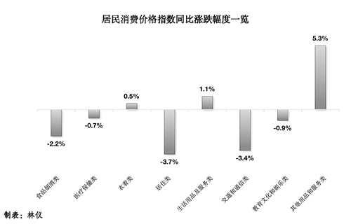 分类别看,CPI八大类商品(服务)价格环比呈“4涨2平2降”态势。其中,教育文化娱乐价格上涨1.6%,交通通信价格上涨1.2%,生活用品及服务价格上涨0.9%,其他用品及服务价格上涨0.8%;衣着和医疗保健价格持平;食品烟酒价格下降0.3%,居住价格下降0.1%。