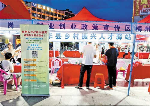 每逢梅州客家主场比赛日,五华奥体中心广场总是人头攒动、热闹非凡。广场上,“人才夜聘——星光职通车”现场招聘活动采用“线上直播+线下现场招聘”形式,实现“场内看球、场外应聘”的生动场景,促进企业与人才的精准匹配。
