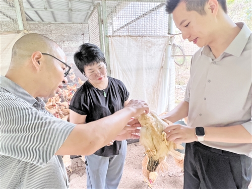 姚婉清团队成员走进丰顺县田苑种养专业合作社的鸡舍,与养殖户一同查看“山苍子无抗鸡”生长情况。