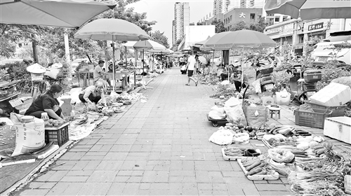 梅江碧桂园小区出入口附近,上百米的人行道路段被数十个摊贩占据。(陈坚平 摄)