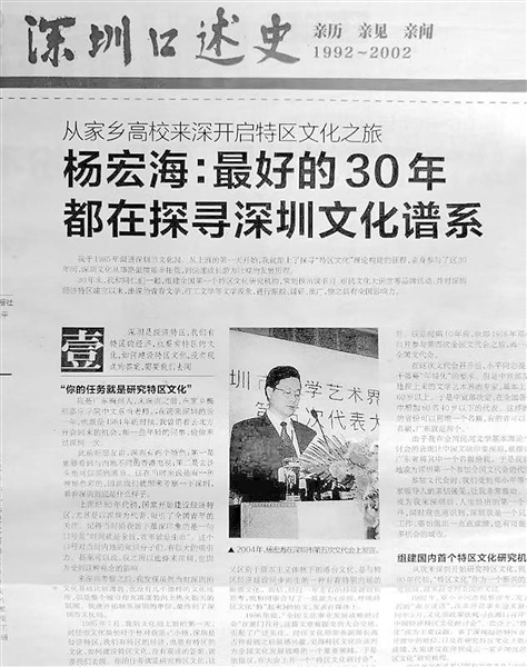 弹指一挥间,深圳改革开放已走过45个春秋。当年“文化沙漠”的传闻早已烟消云散,特区文化如朝阳出海,蔚为壮观。我自1985年调入深圳后,一直在文化部门工作,退休后也仍在文化领域发挥余热,40多年从未停歇。记得我在退休时曾出版了一部《我与深圳文化:一个人与一座城市的文化史》(上、下卷),记录了自己的工作实践与心路历程。回首往事,我几乎亲历了深圳文化建设的开拓全过程,参与了影响深圳文化发展的大部分重大实践。2015年10月14日,由深圳市政协、深圳晚报社联合主办的《深圳口述史》,对我进行专访的标题是《杨宏海:最好的 30年都在探索深圳文化谱系》。是的,我庆幸自己在最好的青春年华,有机会与众多“拓荒牛”一道,最早一批投身深圳经济特区文化建设,在“文化深圳”的探索与实践中砥砺前行,不断实现人生价值。感恩改革开放的伟大时代,祝福深圳文化的明天更美好!
