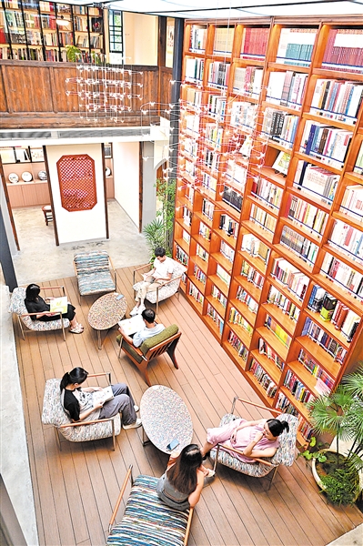 推开大门,咖啡香和书香交织,“风眠书院”四字映入眼帘。往里走,中庭一面六米高的开放式书架直抵玻璃天井,阳光洒落照亮6000余册涵盖艺术、摄影、收藏、儿童等类别的图书,而这面书架已成为游客打卡的“标志性景观”。