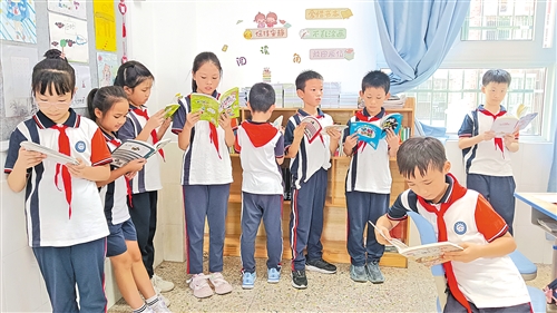 下课铃声响,走进客都小学四年级五班的图书角,它像个小小的“魔法空间”吸引来一群“小书虫”。开学不久,孩子们你一本我一本,从家里带来的书让简易的书架有了温度。瞧,有的孩子靠着墙,手指轻轻滑过书页;有的凑在一起,小声分享书中的趣事;还有的刚从书架抽出书,眼睛就亮起来。原本短暂的课间,被这些认真阅读的身影,酿成了满室的书香。(曾卫君)