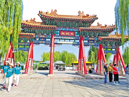 带着博物馆给予的人文脉络,我们深入泉城。首站是“泉城明珠”大明湖,这一天然湖泊由城内众泉汇流而成。湖东矗立“天下第一楼”超然楼,为大明湖标志性建筑,尤其亮灯时分,夜色中的楼阁更显奇幻;湖畔杨柳依依,与湖光相映成趣;湖心岛上的历下亭,留有杜甫“海右此亭古,济南名士多”的诗句;湖面游船往来,令人不禁想起《还珠格格》中“大明湖畔的夏雨荷”。