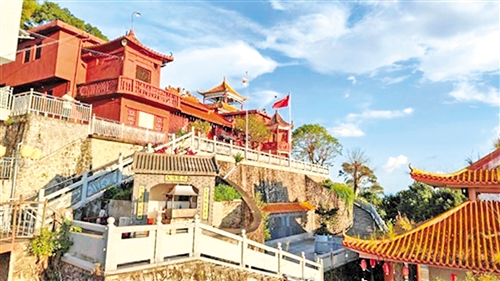 这座海拔500多米的孤峰是兴宁市古八景之一,峰顶灵化寺始建于宋末,历经兴废,如今红墙黄瓦在苍松翠木中格外醒目。整座寺庙依山而建,分三级平台层叠而上,气势恢宏庄严。相传宋代探花罗孟郊夜读神光山时,曾闻此山雄鸡报晓,因而得名“鸡鸣山”。