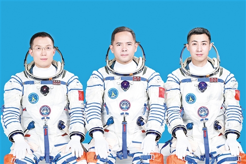 神舟二十一号航天员张陆(中)、武飞(右)、张洪章(左)。(新华社发)
