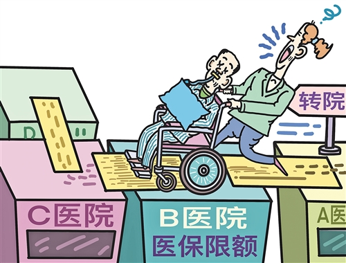 “今天是转院的日子,住了4天又出院了。”日前,安徽合肥的陈丽霞在微信朋友圈发了一条状态。陈丽霞的父亲是一名胶质母细胞瘤患者,后因肿瘤造成的呛咳引发重症肺炎。今年4月以来,她陪父亲辗转多家医院,最频繁时“1个月换了4家医院”。究其原因,原来针对脑癌的靶向治疗,医保限额是8000元左右,治疗肺炎的医保限额是8000元左右。为了不超过限额,住院10天左右就不得不出院,找别的医院继续治疗。