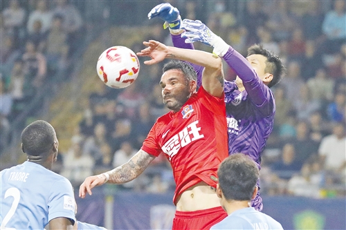 图为梅州客家球员约契奇(红)和对方球员争顶头球。(林翔 摄)