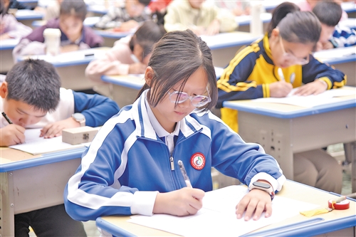 硬笔比赛分成小学低年级组、小学高年级组和中学组,三个组同步进行。赛场内,选手们统一使用比赛专用纸,满怀激情,坐姿端正,遨游在汉字的海洋中。他们精心雕琢每一个笔画、每一次运笔,轻落重按、缓急有致,眼神透露出对书写的执着。墨色浓淡间,经典名篇的韵味缓缓晕开,恰如秋日云霞漫过纸面。每一幅作品里,都藏着少年对书法艺术最纯粹的热爱与虔诚。小小的方格之间,流淌着笔墨之香,洋溢着文雅之风。