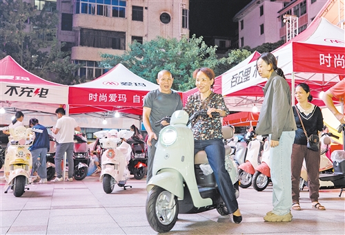 首届客都消费新市集现场,市民在试骑、选购电动自行车。(林翔 摄)