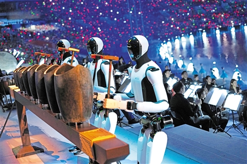 顺着那束光望去,奏响文艺展演第一串音符的,是三台工业人形机器人。它们站在交响乐团最后一排,双手持锤,敲击着千年前的中国古代乐器——青铜句鑃。