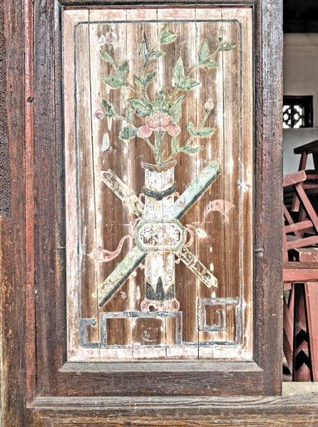 进入大门后是下堂(门厅),正对面是木质屏风,屏风两侧为出入的屏门,屏门下方的拼板上浅浮雕有花瓶和插花及画轴等静物,寓意平安富贵。两侧墙壁绘制有客家地区传统的墙裙壁画,每个板块内部绘制有花鸟或山水纹样,蕴含吉祥寓意;下堂后面天井两侧侧厅三面围合,面向走廊一面有四扇木质屏门形成开启面,屏门分上下两部分,上面是可调节通风采光的竖向条形格栅推拉窗,下面是浅浮雕拼板,图案为花瓶插花和卷轴宝剑彩带等,寓意平安富贵、文武双全;上厅装饰总体朴素,正后方是木质拼板的太师壁,各镶板上矿物彩绘制了静物寿桃等吉祥纹样,太师壁前摆放了祭祀用的案台,氛围庄严神圣。两侧墙壁的墙裙壁画内容丰富,既有吉祥含义,又具有一定的时代性。