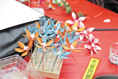 今年5月,廖静专程前往湖北英山,与当地缠花传承人交流。英山缠花小巧精细,她的作品则仿真度高、风格大气,两地技艺碰撞让她对创新有了更多思考。如今她的工作室里,既有复原的传统神台缠花,也有融入黏土技艺的莲蓬缠花、做成胸针的校园校花“日日新”等,传统与现代的融合让千年缠花更鲜活。