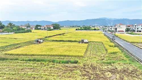 在蕉岭县丝苗米省级现代农业产业园龙安核心区,记者看到,多台联合收割机正开足马力,在广阔的稻浪中往复穿梭。机械过后,一排排水稻被整齐地收割、脱粒,一粒粒金黄的稻谷被尽数“收入囊中”。“今年晚稻收割实现丰产稳产,我们在龙安村种了300多亩丝苗米品种南晶香占,这个月已经开始陆续收割。得益于充足的雨水和适宜的天气,亩产大概1000斤,收成相当好。”建丰粮业种植部负责人傅新华说。