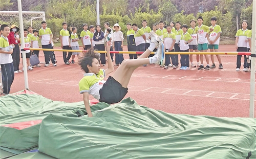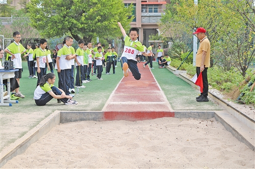 跳远场地上,小健将们助跑、起跳、腾空、落地,不断超越自我。