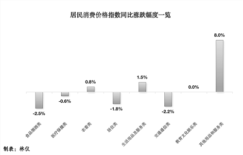 分类别看,CPI八大类商品(服务)价格环比呈“4涨1平3降”态势。其中,其他用品及服务价格上涨2.5%,食品烟酒价格上涨1.0%,居住价格上涨0.9%,教育文化娱乐价格上涨0.4%;医疗保健价格持平;衣着价格下降0.2%,交通通信价格下降0.2%,生活用品及服务价格下降0.1%。
