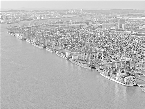 图为繁忙的广西北部湾港钦州港区。(新华社发)