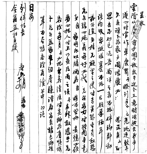 “儿行千里母担忧”,对叶家兄弟而言,“母在故乡儿牵挂”是更真切的日常。他们在南洋谋生的艰辛里,母亲钟氏的身体健康,是跨越山海也放不下的牵挂。批信中的每一句问询、每一声叮嘱,都藏着无法亲侍的愧疚与牵挂。