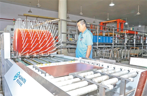 走进位于蕉华工业园区的梅州市鸿利线路板有限公司的生产车间,记者看到,一台台自动化设备高速运转,一件件产品整齐排列,工人们有序对印制的产品进行钻孔、电镀、防焊、测试、检查等,加快赶制新能源汽车、逆变器产品的电路板订单。“企业今年产值有8000多万元,产品主要出口到中东地区、东南亚的一些国家。线下通过‘增效降本’的方式去维护老客户,线上通过电商平台去挖掘客户,扩大我们的销售渠道。”梅州市鸿利线路板有限公司厂长黄国安说。