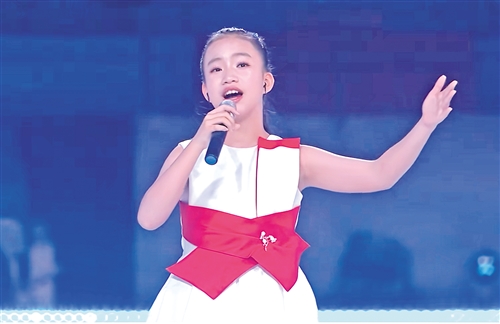 来自五华的小歌手古钰站在舞台中央,以清亮婉转的嗓音领唱《岭南月光光》。(华宣)