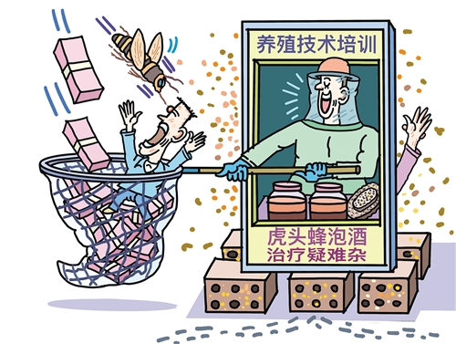 近日,有消费者向央视《财经调查》栏目反映,网络平台上,一些商家以虎头蜂能治病为由,大肆兜售这种毒蜂,甚至有人大规模养殖这种毒蜂牟利。在一些直播间里,虎头蜂被明码标价一只1元到2元,主播强调,虎头蜂可以直接泡酒喝,也可以用于身体涂抹。