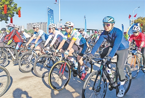 500名骑手从世界客商中心出发,用车轮代替脚步,共同感受梅州的活力与魅力。(李盛华 摄)