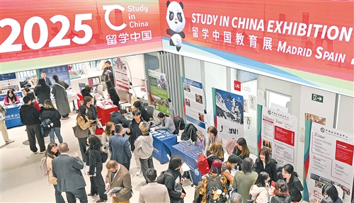 图为在西班牙首都马德里拍摄的2025年西班牙“留学中国”教育展现场。 (新华社发) 11月21日,2025年西班牙“留学中国”教育展在马德里举办, 山东大学、东南大学、中央美术学院等十余所高校和研究机构参展,向西班牙院校和观展民众介绍相关留学政策、服务体系、特色专业等,为有意愿赴华交流学习的西班牙学生提供面对面咨询。